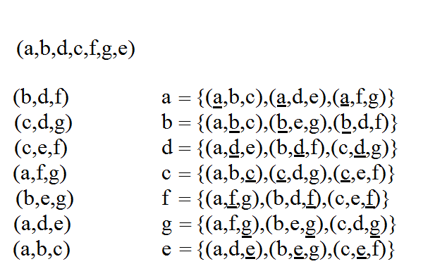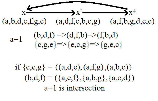 but when altered to align with 'a' = [0,a,e,f] or others we would have the same contradiction. There then appears to be trouble unless we use the C7 element associations of our right hand octal to the subgroups (triples) of the left hand: yet this gives rise to infinite descent unless we take groups of subgroups under K4 addition and associate these groups of subgroups with their single element intersection, i.e. to associate "a" with a group [0,(a,b,c),(a,d,e),(a,f,g)]. Then we may never align "a" with a subgroup (a,X,Y).