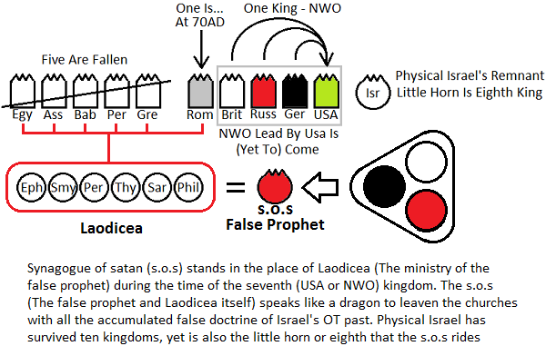 If the first six heads correspond to the first six churches of revelation and the last laodicea, we can align each church with some apostasy from OT Israel that has found its way into the church, to which Jesus wrote in seven letters for those within to come out. The white horse rider's crown (Death's, or Wormwood's) is used to instantiate this "Death" spirit physically in the formulation of the modern USA. The use of 'wormwood' to do this identifies this re-use of the one crown of satan to construct the beast physically and as definitively from the "sea". The six heads before the USA represent the historical strength of antichrist upon Israel before Christ came, as well as in this last kingdom (the USA) after Christ.
