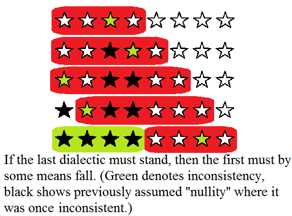 With reference to the dialectic process I should make mention the results of more recent study that could have meaning for the phenomenon of "twice-speak" that is used by the angel and elsewhere by Jesus as in the gospels to emphasize the parts cut off. The dialectic process is forced to accrue with every increment of sequence so that the "tail of the dragon" is either inconsistent with itself or suffers a discontinuity. Consider the diagram, where each position in the tail represents a shifting logical (dialectic) position that becomes inconsistent in its fourth possible application that is only filled with the human heart in place of a third seal device to complete a quad as in the fourth seal.