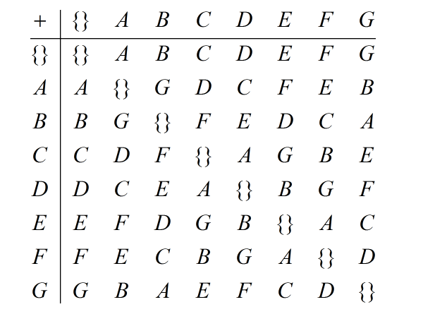 Now we have [b,d,e,c], [f,c,g,b], [d,e,f,g] form a K4 group under symmetric difference. However under symmetric difference any two elements form a third from the set in the rightmost column. (We have closure) We also have (x + y) + y = x and also (x+y)+z=x+(y+z) (inverses and associativity) The empty set fulfils the role of the additive identity. (So we have a group.)
