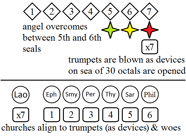 Merely think of the seven trumpets after the sixth seal as (the completed overcoming of) the generalised case of that which the angel overcomes in the churches. Whilst they (as devices) were overcome in one single circuit of one seven cycle by the angel - the trumpets open that sequence over every seven cycle in every octal in and across seven symbols. Then the overcoming of the same devices are witnessed to by the two witnesses as within every octal. It is within these that the elect go through great tribulation and the "not saved" are simply left to go completely evil about them.