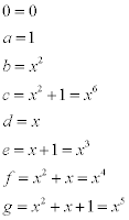 Firstly, we now have every quadratic polynomial in x as the additive group of our octal part of the finite field of eight elements (called GF(8)+). If we wish to define a multiplication then we require powers of x from 0 to 7, where x^0 = 1 (with which we should be familiar).