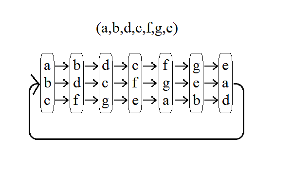 Likewise from Frobenius we know that if "c" is now become 'unity' as opposed to "a" then in the right hand the subgroup {a,f,g} is now static as is the set {b,d,e} in the left handed set. And we have the same invariant correspondence of left and right subgroups to elements.